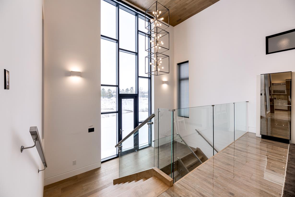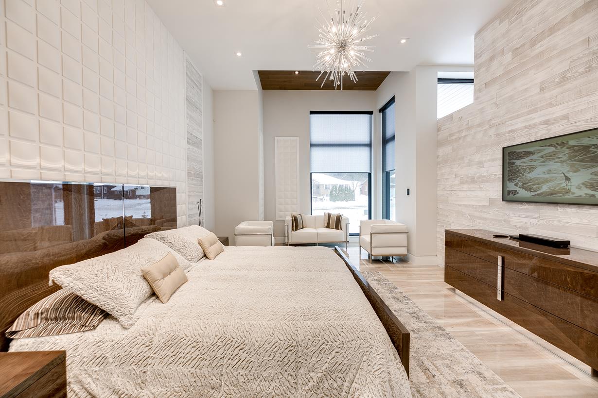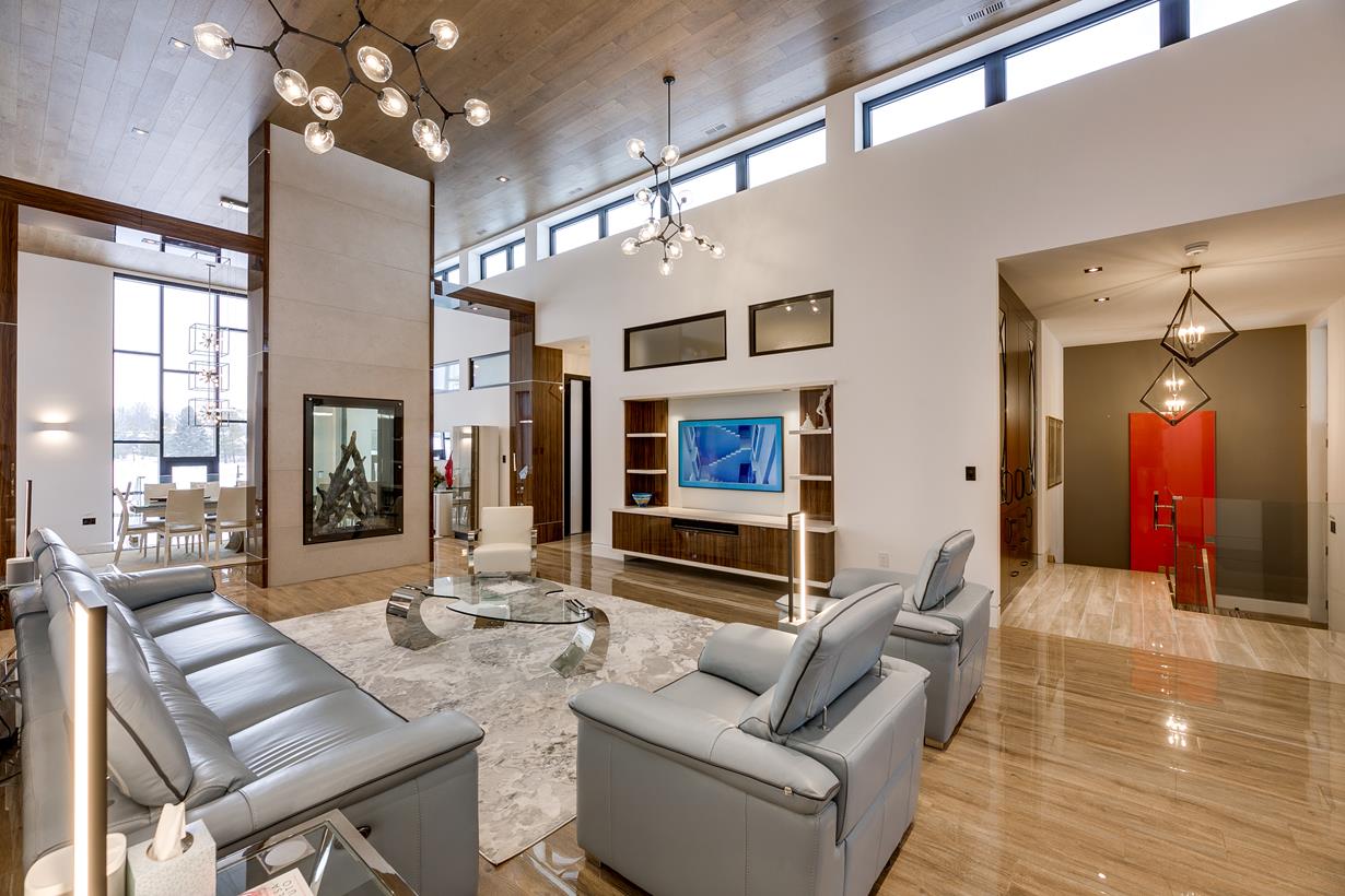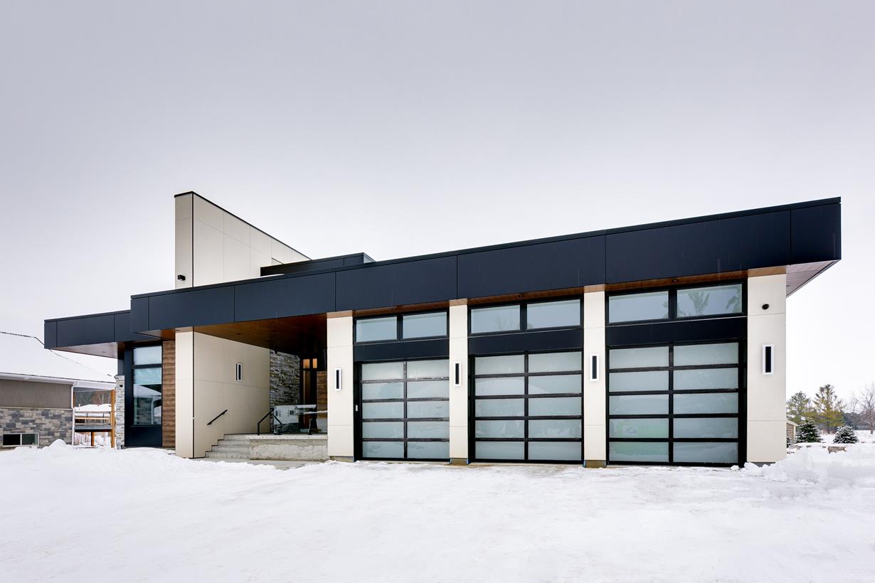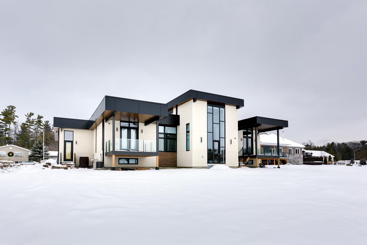 This bungalow in Wasaga Beach, Ontario has a sophisticated modern design with striking canopies and the use of complementary materials put together in a very contemporary fashion. The large entrance canopy and glazed areas make this home very welcoming and pleasing.