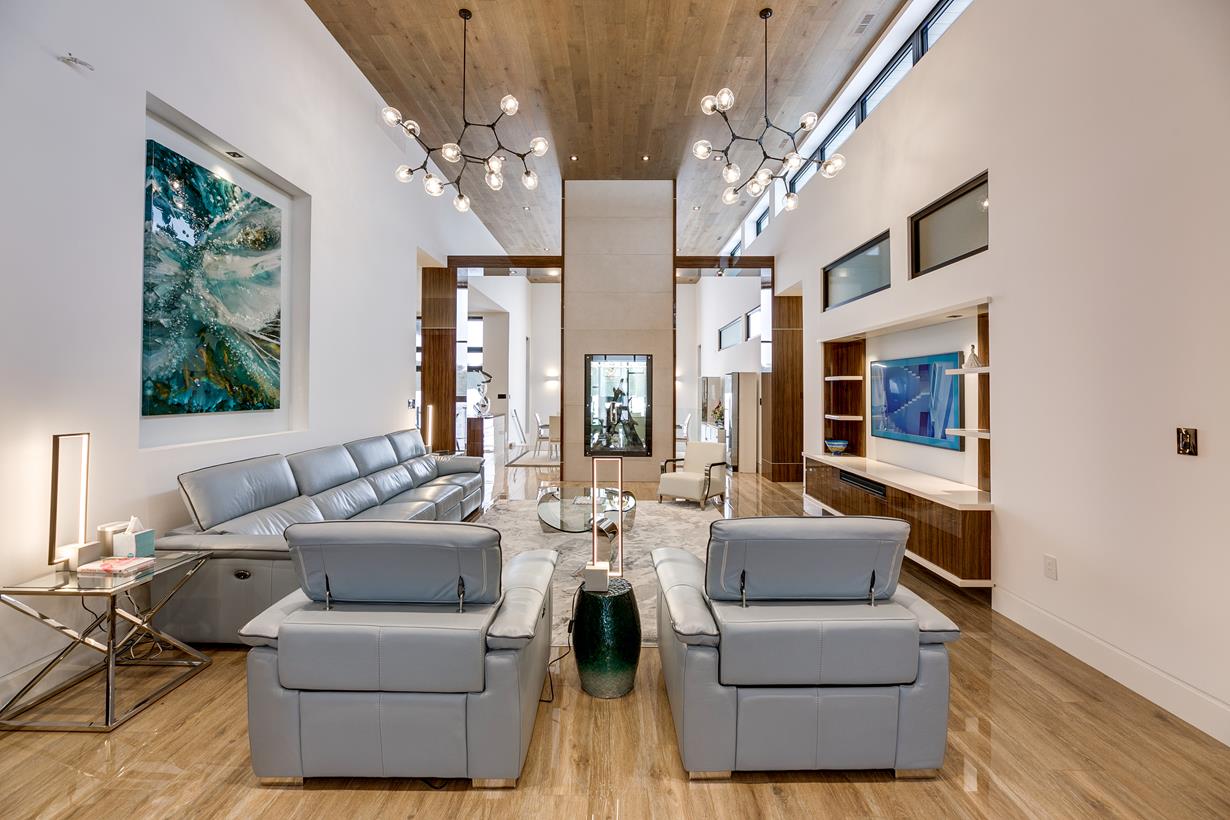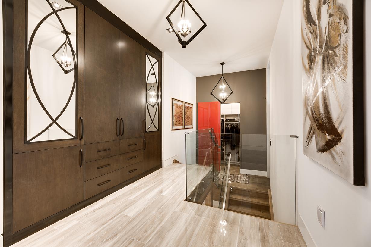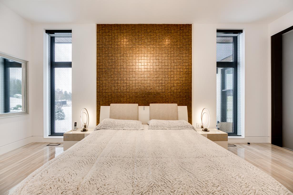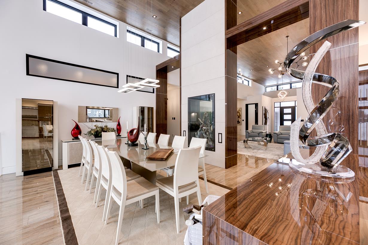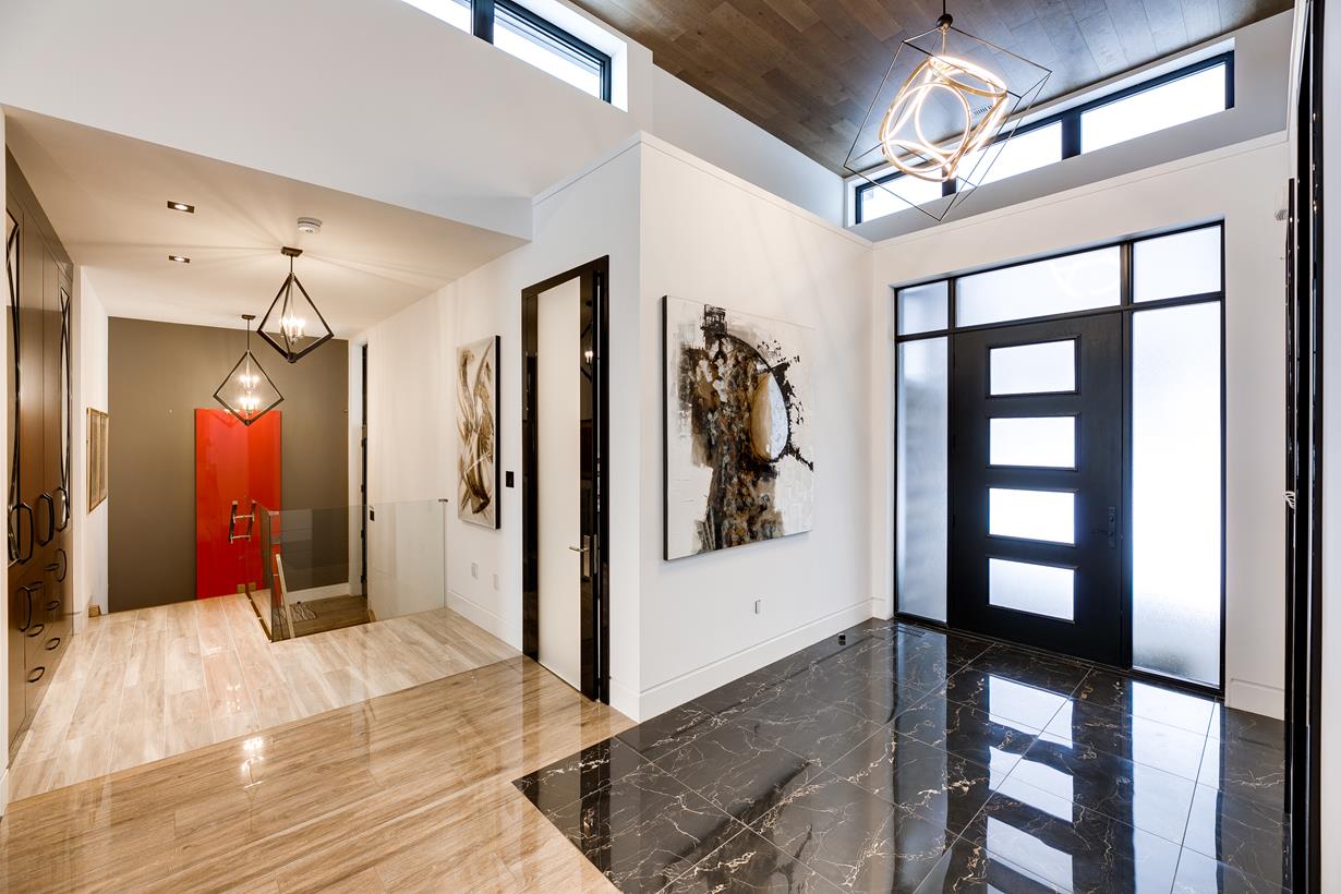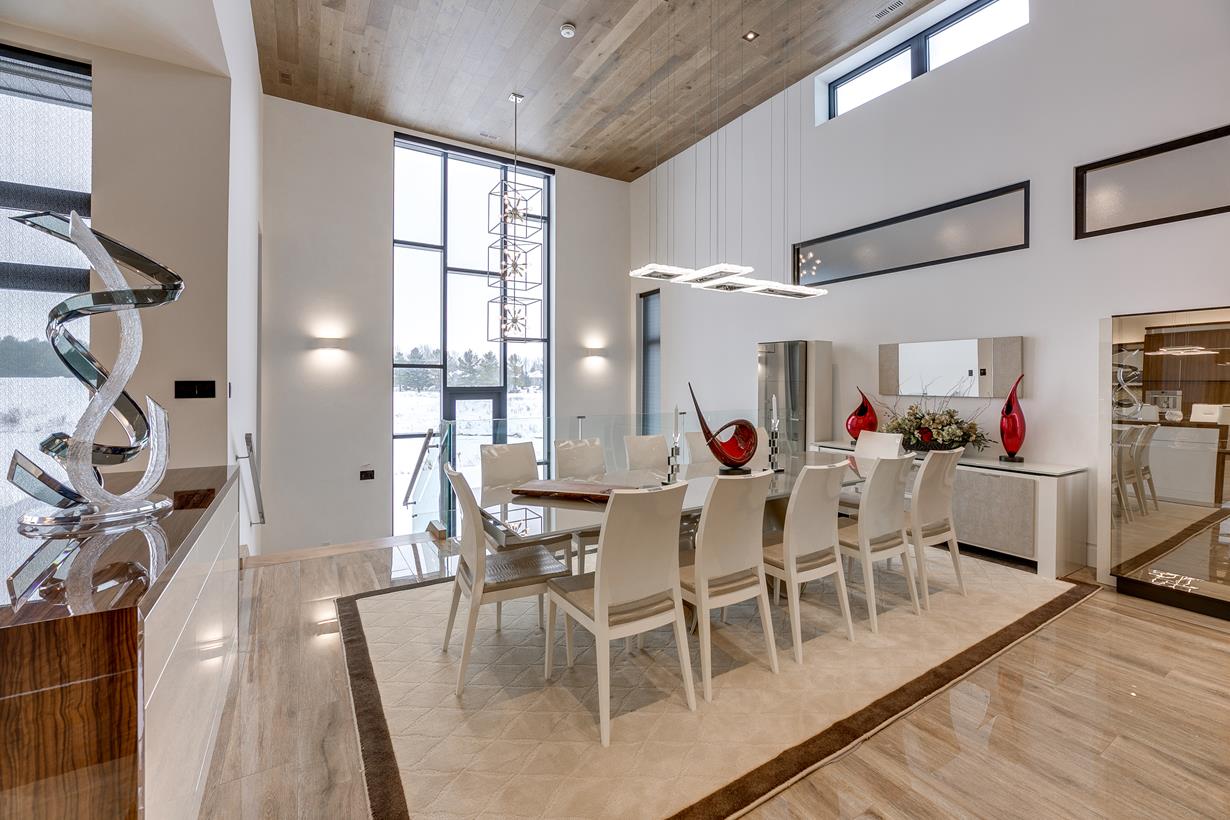 This bungalow in Wasaga Beach, Ontario has a sophisticated modern design with striking canopies and the use of complementary materials put together in a very contemporary fashion. The large entrance canopy and glazed areas make this home very welcoming and pleasing.