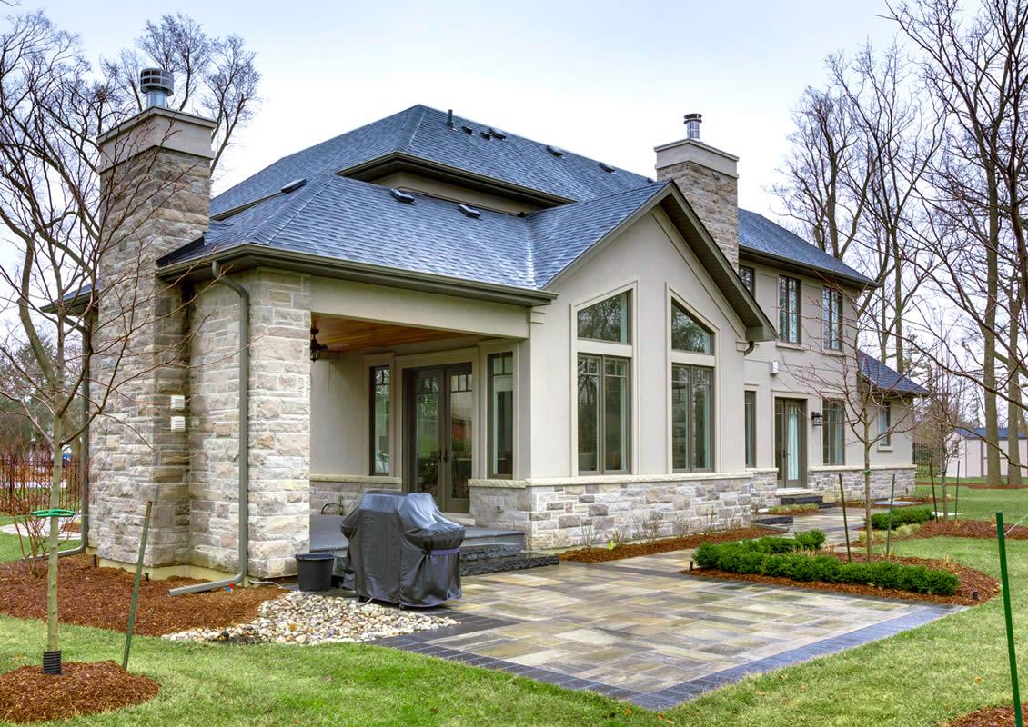 This new modern custom home makes a bold statement in this growing neighbourhood. It has a simple design approach with a folding element that becomes the entrance canopy, “anchored” by the stone vertical wall. Quality materials have been used such as stone and cement panels with wood looking siding as an accent panel.