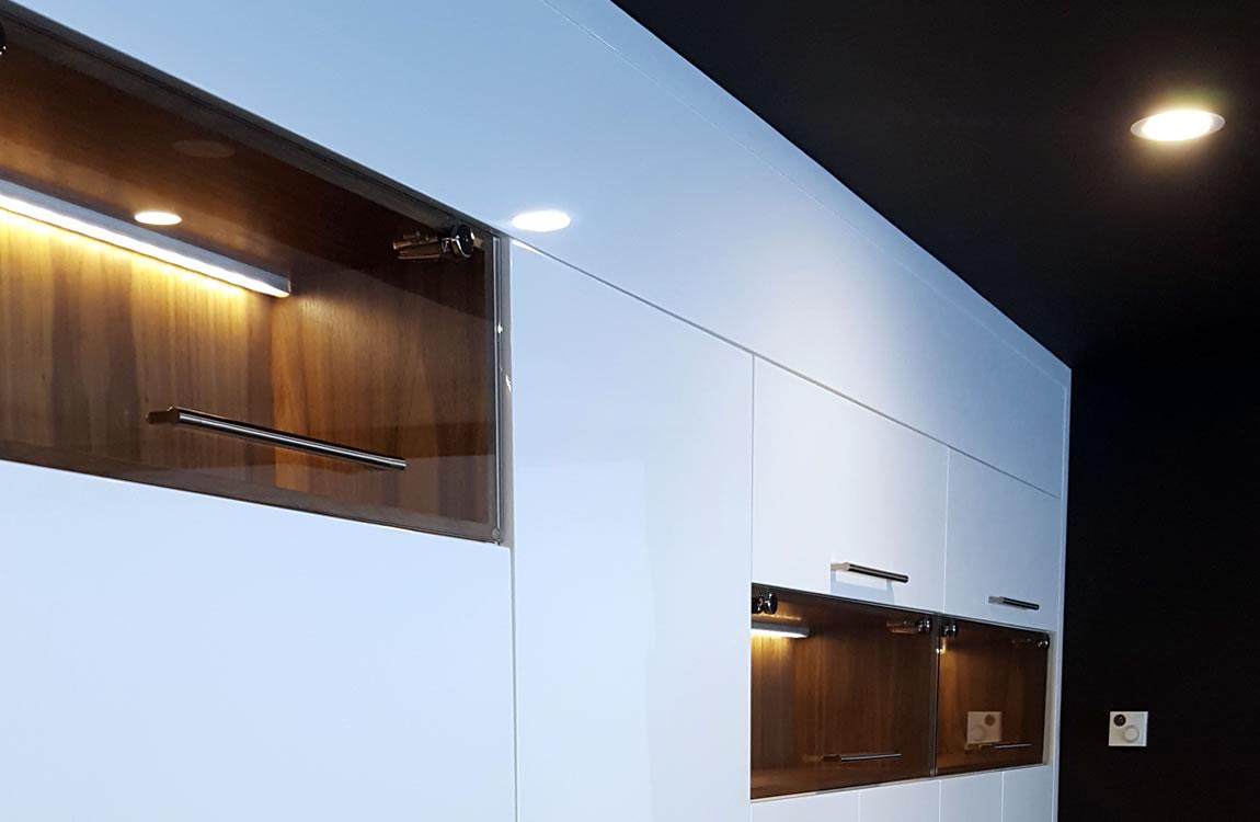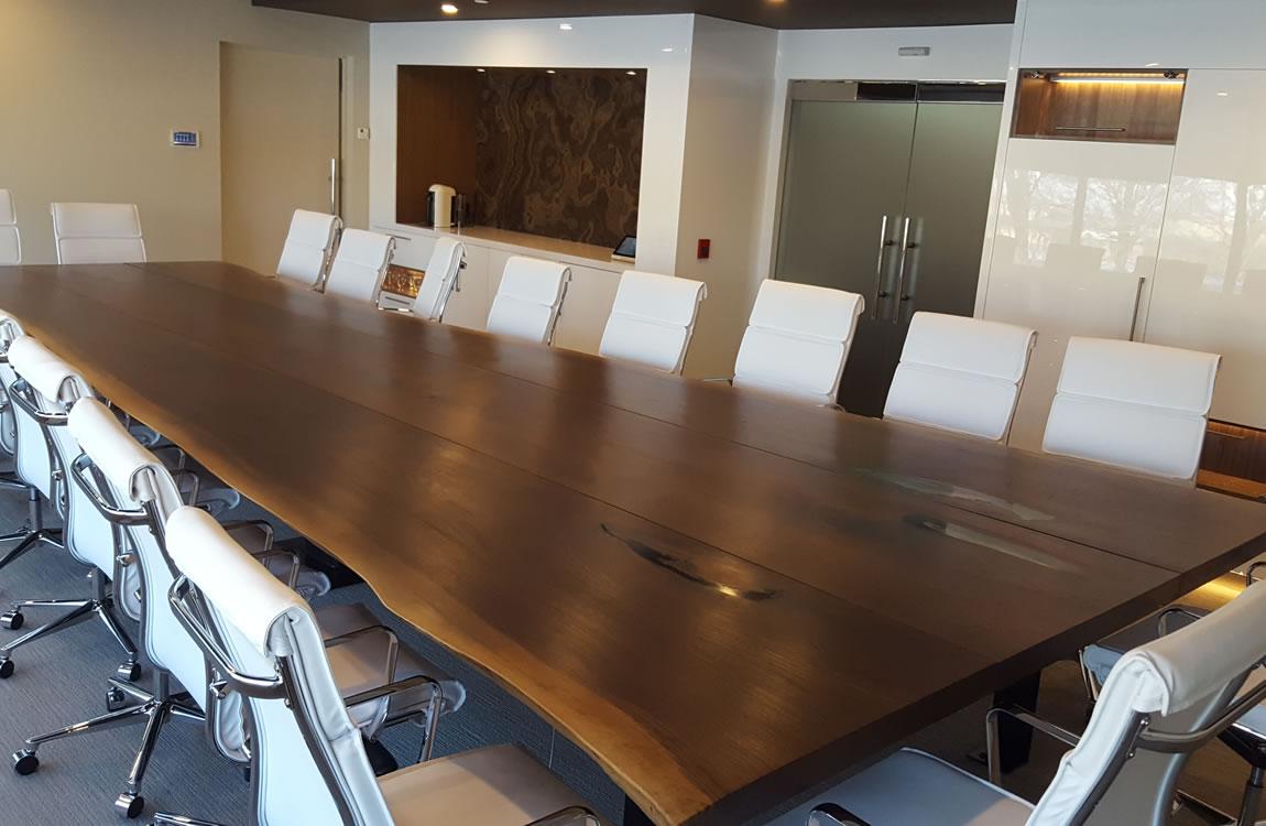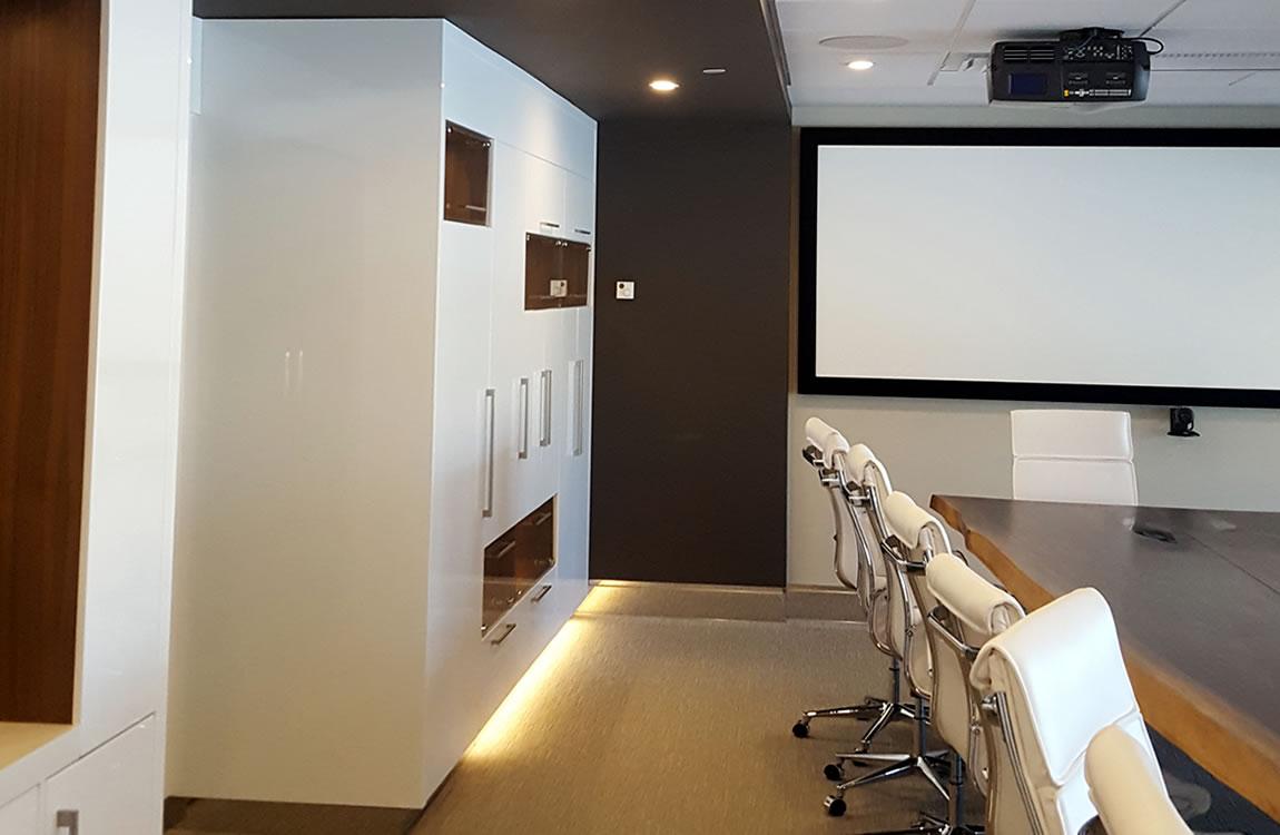 This project involved the renovation of a company’s private President’s Boardroom. It incorporated elegant finishes and simple contemporary design. The two millwork pieces were designed to integrate with the main door. This created a uniform look throughout the south side wall, making the main door the focal point of the room.